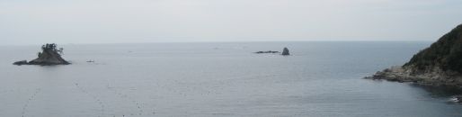 ![]() ![]() まず北に向い、日間賀島と篠島の間に浮かぶ築見島を眺め、南下する。 民宿のある家並みを抜けて東海岸に出る。かなたに佐久島と渥美火力発電所 を望む。